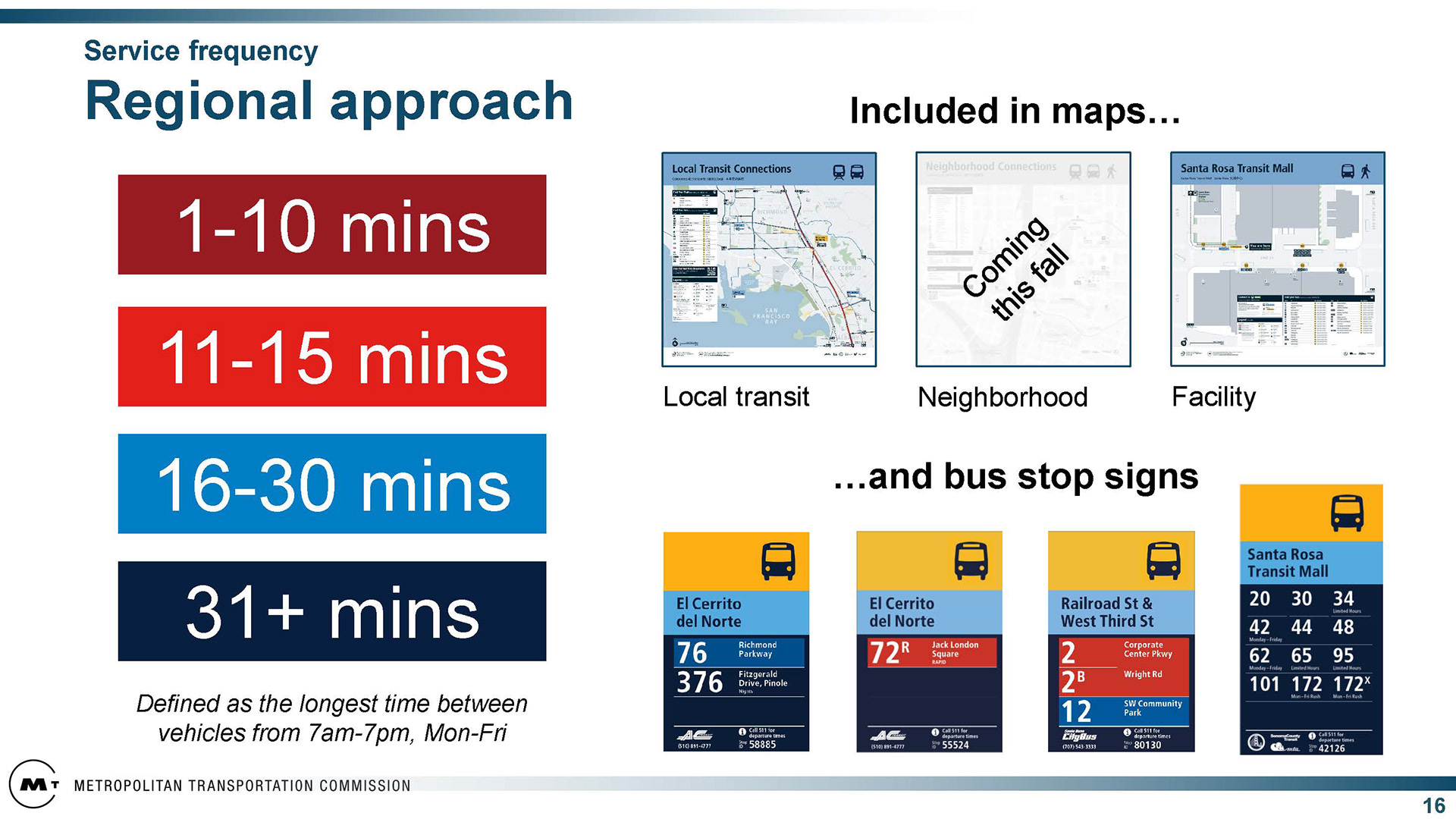 The Regional Mapping and Wayfinding Project will make it easier to ride transit in the Bay Area by making wayfinding materials (maps, signs, screens, etc.) more consistent and easy to identify. Whether you are traveling by bus, rail, ferry, or a combination, the signs and communication systems will be the same across all nine Bay Area counties.