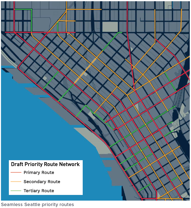 The Seamless Seattle Pedestrian Wayfiding System improves street signage and is one of the strategies being implemented to help the city to meet a goal identified within the Pedestrian Master Plan of increasing walking trips by 35% before 2035.